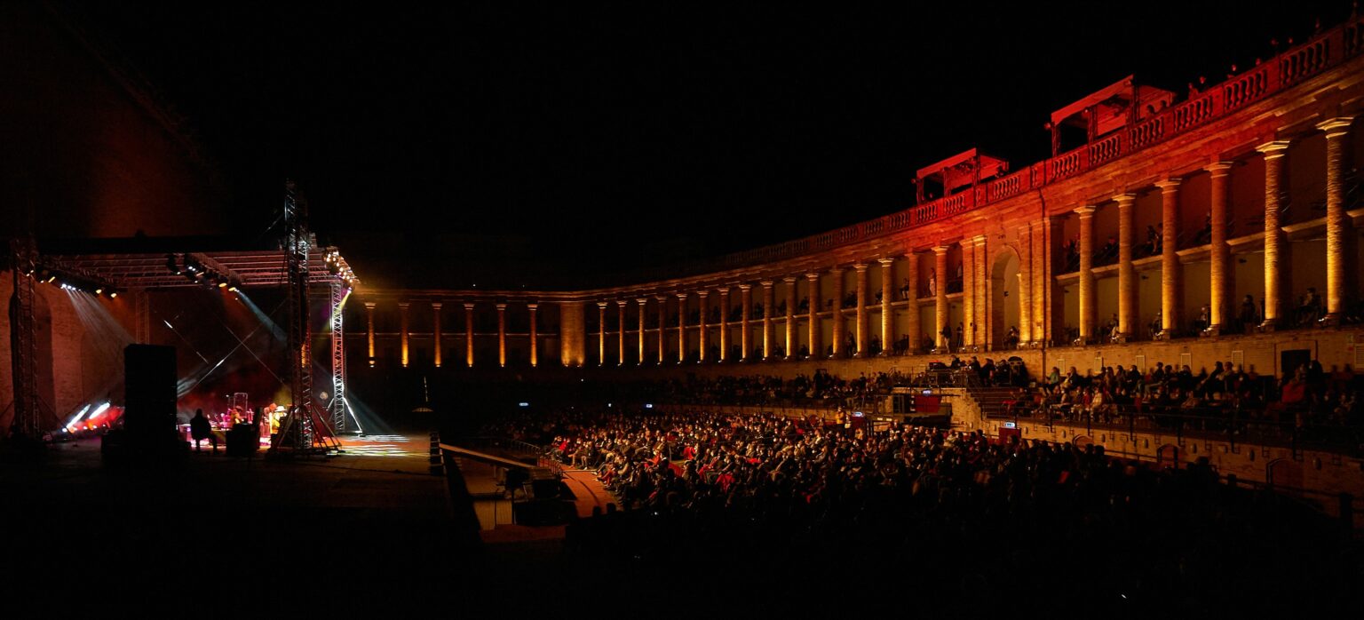 Da 59 edizioni lo Sferisterio non è soltanto il simbolo monumentale di Macerata – città delle Marche tra la costa e i Monti Sibiliini – ma un vero e proprio teatro, l’unico all’aperto con i palchi e con il palcoscenico più ampio d’Europa. La capienza oggi è di circa 2.500 spettatori. Infatti, l’arena – costruita su progetto di Ireneo Aleandri con il supporto di Cento consorti – fu inaugurata nel 1829 “ad ornamento della città, a diletto pubblico” è destinata principalmente al gioco della palla con il bracciale. Nel 1921 e 1922 i primi allestimenti operistici e poi dal 1967 la sua definitiva destinazione a teatro, sede di quello che è oggi il Macerata Opera Festival, rassegna che richiama ogni estate il pubblico melomane più esigente ad applaudire originali proposte e cast prestigiosi. Annualmente la struttura ottocentesca di Aleandri si rivela al pubblico e agli artisti monumentale ma intima, garantendo una perfetta visibilità e un’eccellente acustica. Il sovrintendente Flavio Cavalli e il direttore artistico Paolo Gavazzeni guidano la programmazione del Macerata Opera Festival, realizzata dall’Associazione Arena Sferisterio.